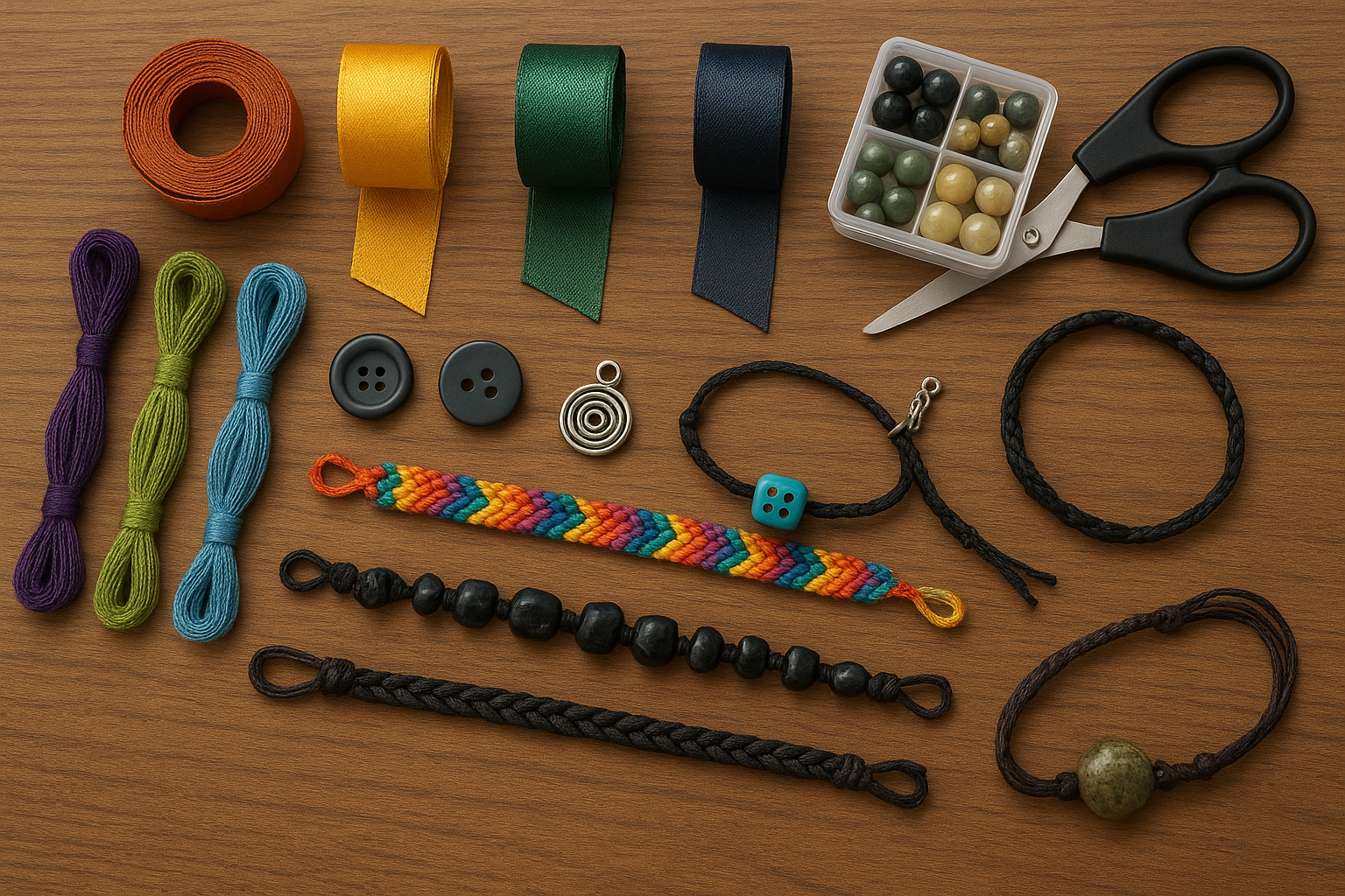 Nach einer kurzen Einführung in verschiedene Knüpf- und Flechttechniken stehen viele Bunte Materialien wie, Bänder, Perlen und kleine Anhänger zur Verfügung.